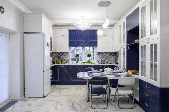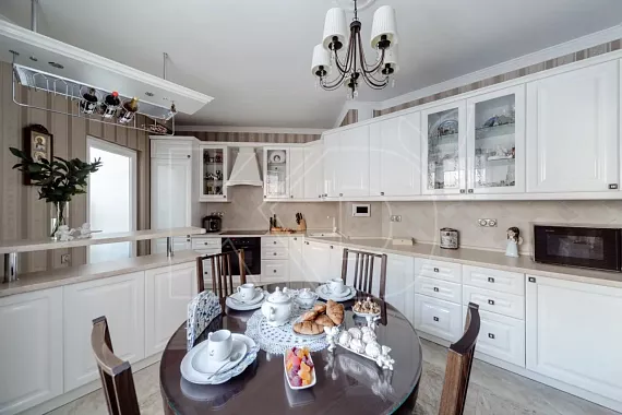 Подобный гарнитур нуждается в большом количестве света и пространства, поэтому он подойдет помещению с большими окнами и качественным искусственным освещением. Хотите установить кухню на небольшой площади? В таком случае лучше избегать объемных люстр и светильников – вместо них предпочтите компактные приборы с рассеянным светом.