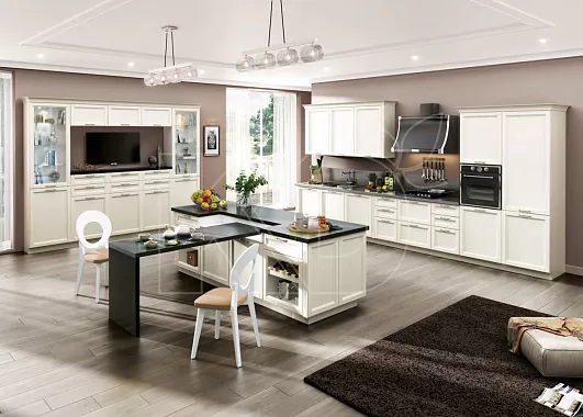 Кухни в неоклассическом стиле напоминают классические интерьеры. Но в отличие от них они лишены тяжеловесности, монументальности и показной роскоши. Их отличают четкие линии, выдержанные формы и симметрия.