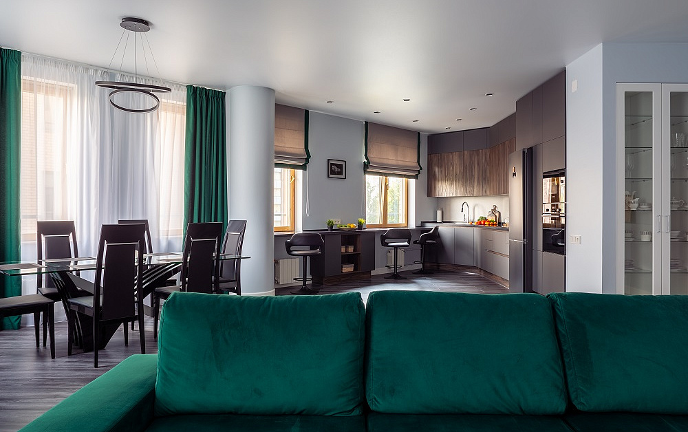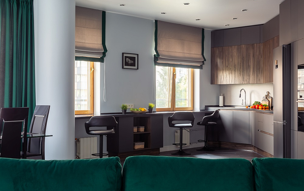 Ещё одна необычная черта проекта – сверхдлинная барная стойка. Она расположена в левой части кухни и охватывает сразу два окна. Стойка является продолжением кухонной столешницы и неотъемлемой частью общей композиции. Здесь можно с комфортом отдыхать или работать, любуясь видами!